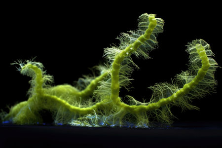 a close-up portrait photograph showcasing the intricate details of unknown helicobacter pylori biological virus alien flowers. the image captures the brittle yet beautiful and dry elegance of the flowers, with rich and vivid contrast. shot on a 100mm lens at f/2.0, the natural lighting enhances the realistic and impressive qualities of the photo. the black tones and crispness add depth of field, resulting in an