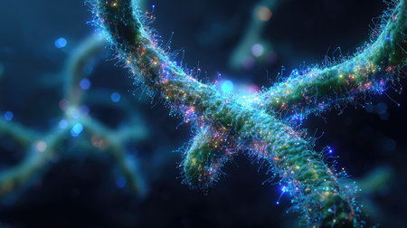 An intricate depiction of glowing bioluminescent microorganisms set against a dark background, showcasing vibrant colors, sparkling lights, and abstract patterns, ideal for scientific or artistic themes.