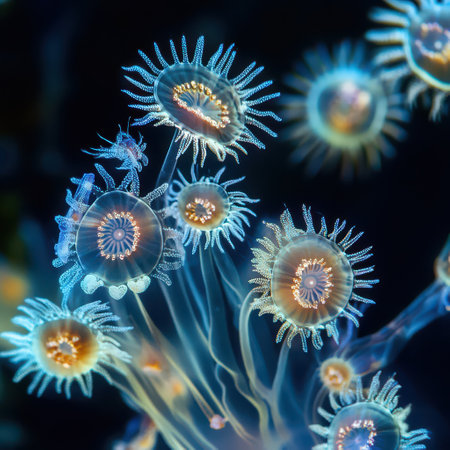 Close-up of plankton glowing in vivid colors under a high-powered microscope, revealing their unique structures