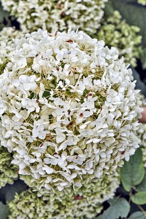 View of beautiful large white hydrangea paniculata blossoms close up