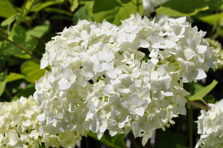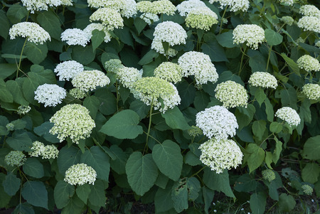 detail of Hydrangea arborescens growing in a garden during summer season