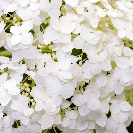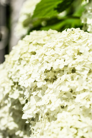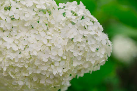 White Hydrangea flowers in a summer garden. Macro shot of beautiful delicate petals.