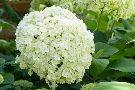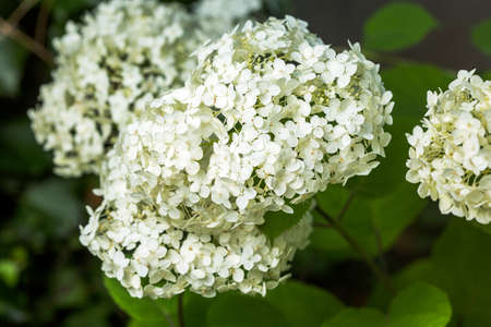 Blooming white hydrangea or tree hydrangea in the summer garden.