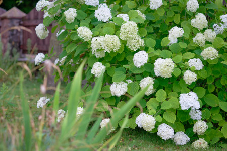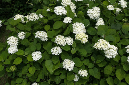 Hydrangea arborescens shrub with white flower clusters in summer.