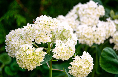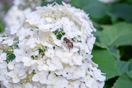 Bee on white hydrangea flowers in a summer garden. Closeup of a bee collecting nectar from blooming white hydrangea flowers surrounded by green leaves in natural sunlight.