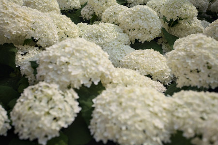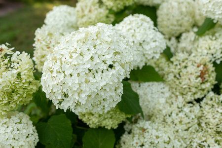 Close-up of a lovely white hydrangea (Hydrangea macrophylla) bush in full bloom in Åódź, Poland.