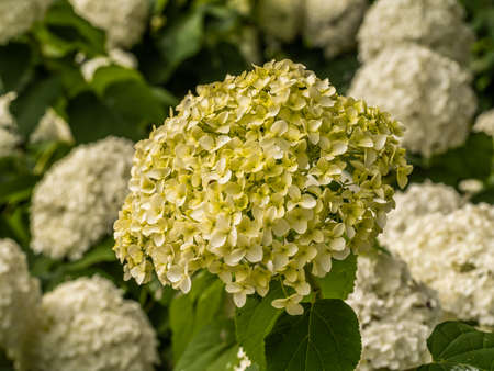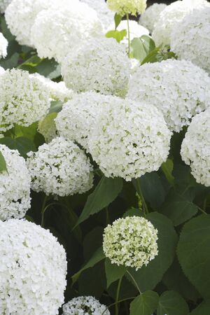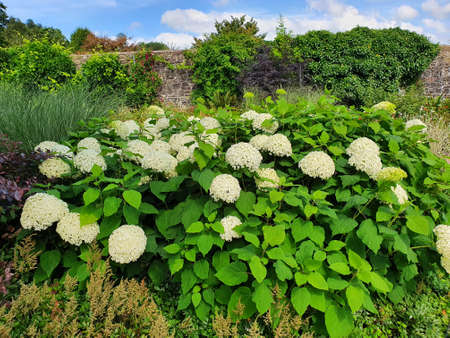 Hydrangea Arborescens 'Annabellea' summer autumn fall flowering plant with a white summertime flower, stock photo image