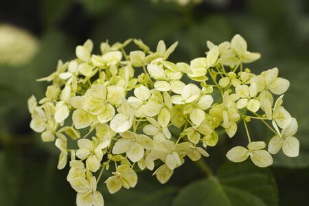 Lush white and yellow hydrangea flowers in summer. White and yellow flowers with blurred background. Hydrangea arborescens, commonly known as smooth hydrangea, wild hydrangea, sevenbark, sheep flower