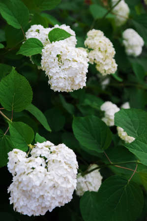White hydrangeas with green leaves in the Park. Freshness
