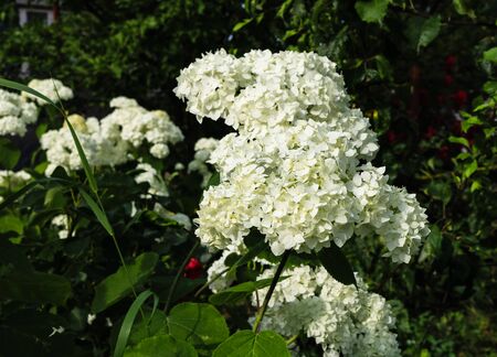 White Hydrangea in the Garden. Blooming white hydrangea plants in full bloom. Nature background
