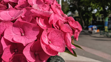 Beautiful carpet of pink blooming flowers. Texture for wallpaper or web banner. Blossoming hydrangea close up.