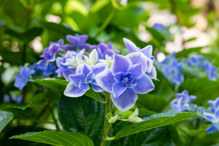 Beautiful blue lacecap hydrangea flowers blooming in early summer
