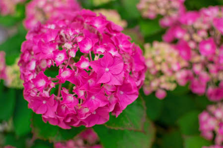 Beautiful pink hydrangea in a garden, hydrangea macrophylla, hortensius