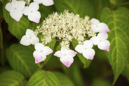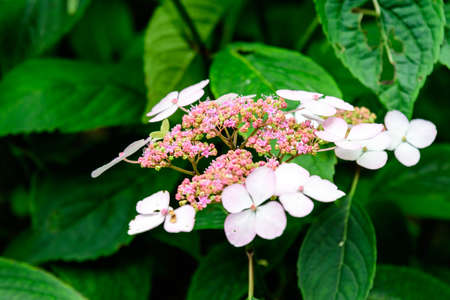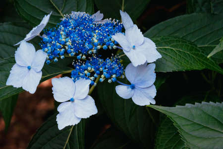 White and blue lacecap hydrangea flower in the rainy season