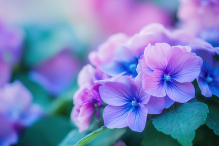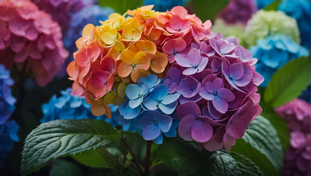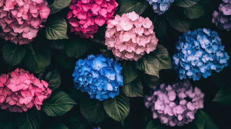 Clusters of hydrangea flowers bloom in purple, pink, and blue hues, intermixed with vibrant green leaves, creating a fresh, natural, and calming visual suitable for floral designs and botanical-themed marketing.
