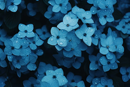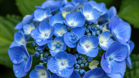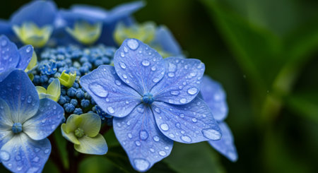 Blue Hydrangea macrophylla flowers with water drops on petals