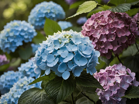 A beautiful display of hydrangea flowers showcasing delicate hues of pink, blue, and purple. The vibrant petals contrast elegantly with lush green leaves in a garden setting.