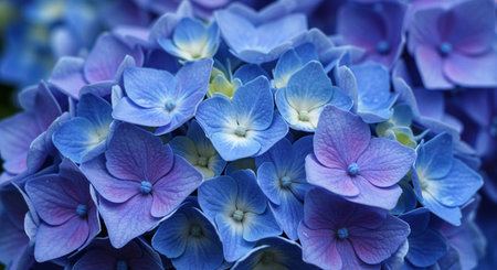 Beautiful pastel blue and purple hydrangea flowers in bloom, close up. Summer blossoms floral texture for background