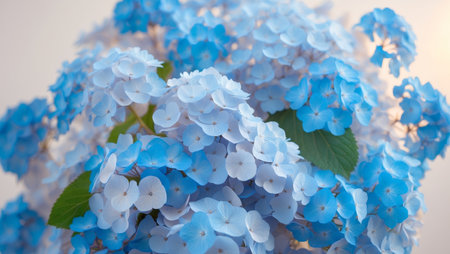 A striking blue hydrangea flower complemented by lush green leaves, isolated on a light gray background. Perfect for design projects, decorations, and botanical themes.