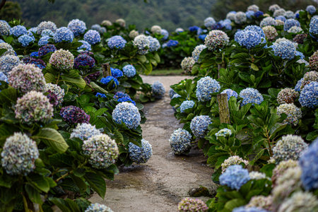 beautiful blue blooming hydrangeas on Sao Miguel Island, Azores, Portugal