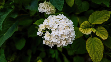 detail of Hydrangea arborescens growing in a garden during summer season