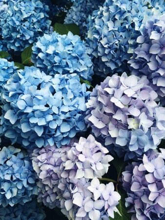 Beautiful blue and purple blooming hydrangea flowers, close up. Floral texture for background.