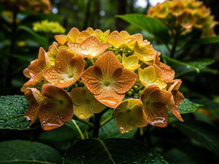 Hydrangea macrophylla flower with raindrops in the garden