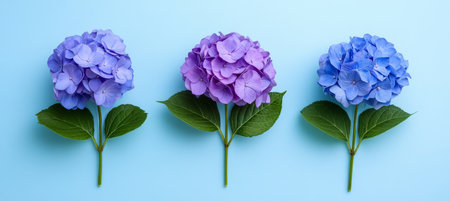 Minimalistic Floral Arrangement Three Vibrant Hydrangea Blossoms on a Soft Blue Background