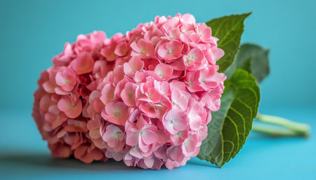 Overhead shot features a cluster of hydrangea flowers exhibiting a transition from vibrant pink to soft blue hues, positioned adjacent to rich, dark green leaves, all set against a uniformly colored, slightly textured cyan background, creating a contrast between the organic subject and the flat setting.