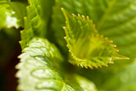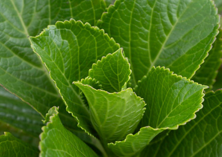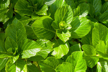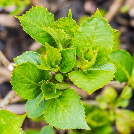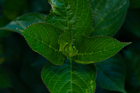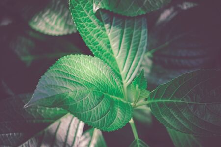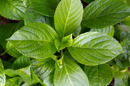 Beautiful Leaves of the Purple Flower Hydrangea macrophylla species known in Japan as Gaku-ajisai.