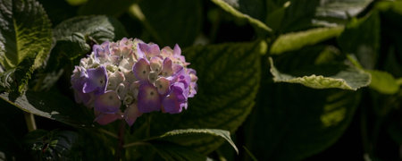 A single purple hydrangea in full bloom, surrounded by dark green foliage. The image evokes a sense of tranquility and mystery.
