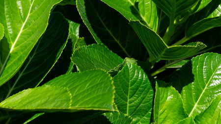 Bright glossy fresh leaves of hydrangea bush. Tropical botanical garden Monte Palace, Funchal, Madeira, Portugal.