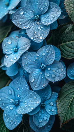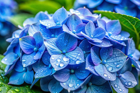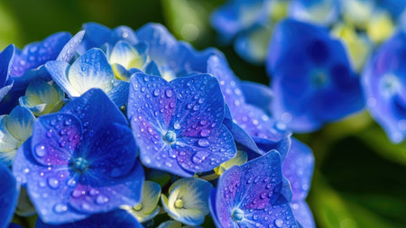 Blue hydrangea flowers with dew in a garden, nature close-up. Serenity and freshness concept