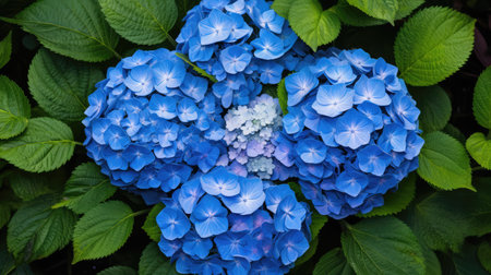 Vibrant blue hydrangea flowers in lush green foliage