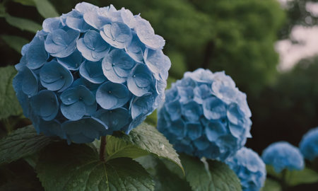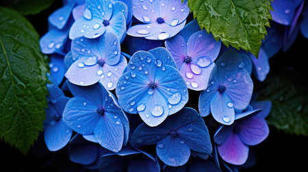 Blue hydrangea flowers with dew in a garden, nature close-up. Serenity and freshness concept