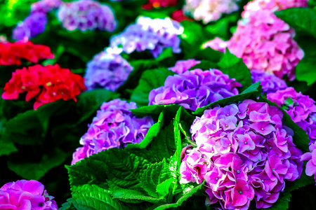 Pink and purple hidrangea in garden in summer