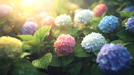 View captures several large clusters of hydrangea flowers in various colors including pink, white, blue, purple, and yellow, nestled among dark green, wet foliage. Brilliant, warm sunlight streams in from the upper left corner, creating a luminous glow and highlighting droplets of water clinging to the leaves and petals, suggesting recent rain or mist.