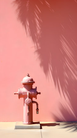 Red fire hydrant with shadow of palm leaves on a pink wall