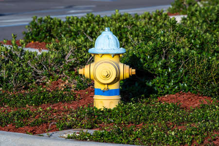 Close up photograph yellow painted fire hydrant in an overgrown grassy area for a new undeveloped subdivisi metal color