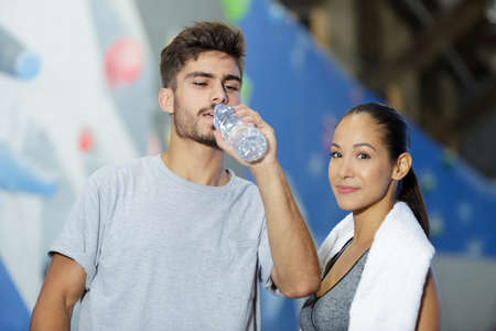 Ensure you drink enough water before, during and after exercising. Shot of two sporty young people drinking water while exercising outdoors.