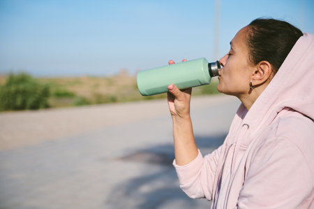 Side portrait of a happy serene woman drinking water from a steel bottle, resting outdoor after intense workout. Healthy lifestyle concept