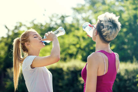 Two young women having break after jogging and drinking water.