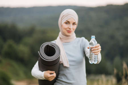 Focus on bottle with water. Charming woman in hijab and sport clothes standing at green park and holding yoga mat and bottle of water. Concept of people, activity and recreation.