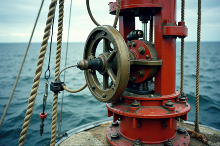 Red nautical equipment on boat with ocean background and ropes.