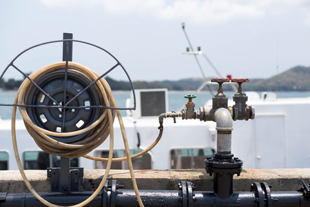 Water hose by dock pier and water valve