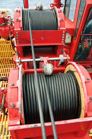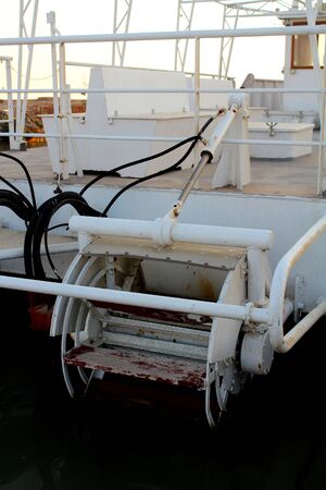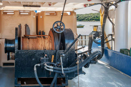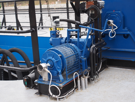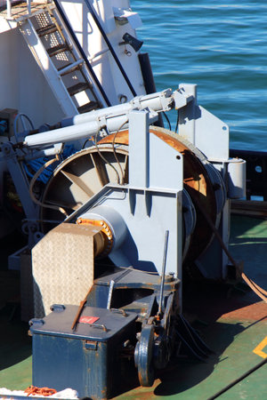 Equipment on a sea tug. Winch for mooring to pier.