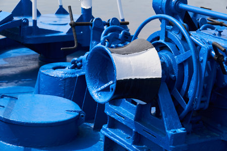 anchor windlass, capstan and other mechanisms, painted blue, on the foredeck of the ship, close-up