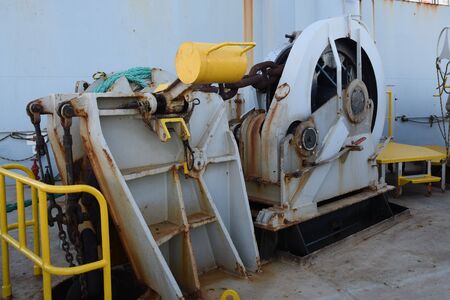 Forward mooring and anchor winch, windlass, in the merchant container vessel with yellow chain stopper, slightly rusted