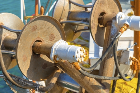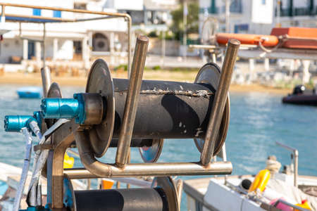 Metal device on the cutter cutter moored in the port. Piso Livadi, Paros Island, Greece.