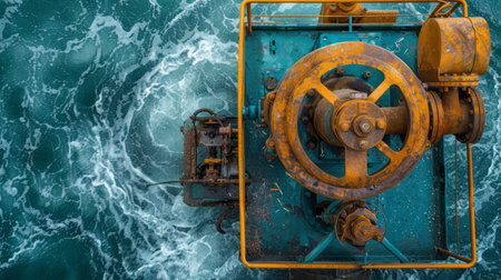 Bird's Eye View of Industrial Machinery Over Turbulent Ocean Waters Aerial Shot of Rusty Mechanical Equipment with Swirling Sea Waves in Motion AI Generative